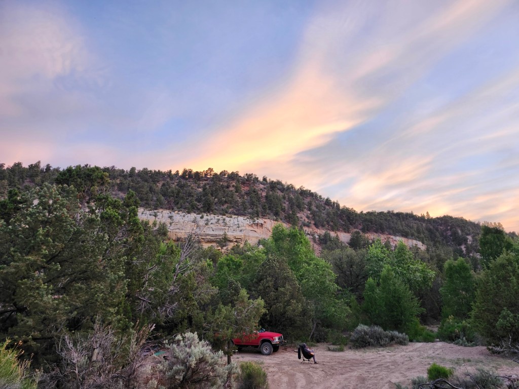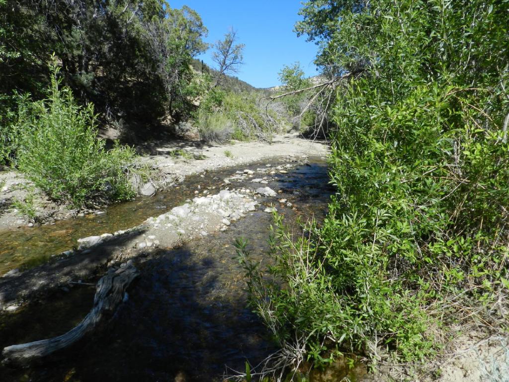Off of a bend in the main highway that connects the local towns, we find the dirt road that leads up a canyon to higher elevations. Supposedly there are pine trees and cooler temperatures. I’m tired. There is a creek running along this route, which is encouraging. I find a small rough road, a two track jeep trail that is running through tall brush and trees to something, perhaps campsites.