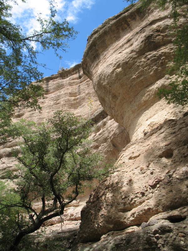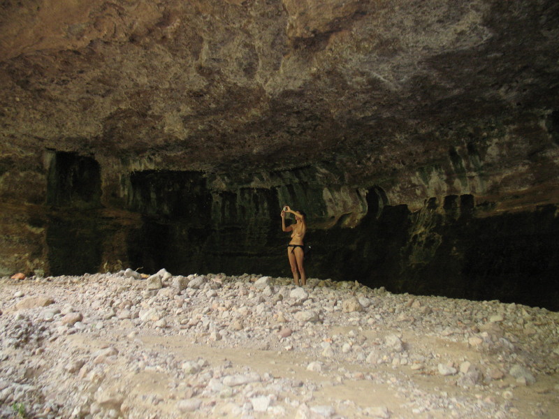 Just up a tributary canyon, we find a cave where water digs through each hard rain.
