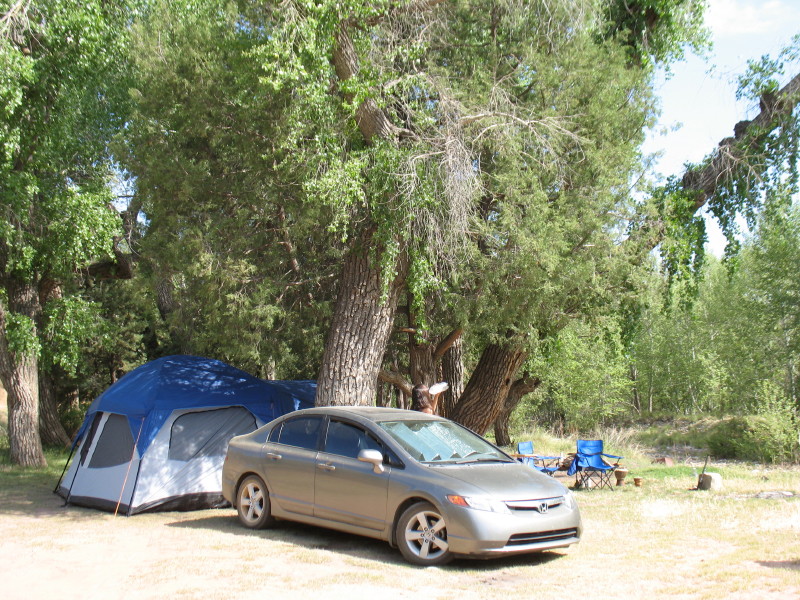 Any camping down next to the stream would have to be packed in. It exposed us for about 200 feet walking mostly on a river rock bed, which was very slow moving. DF donned a pullover sundress and I wrapped a cloth cover over my waist at first, but soon got braver listening before walking through. Once, I used the chairs to cover myself when a forest service truck drove by. It looked silly, but was effective.