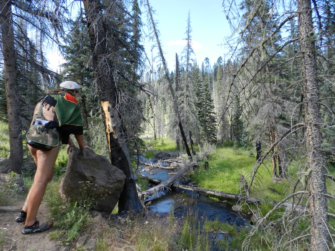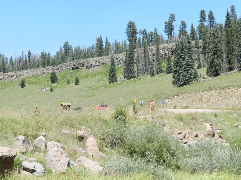 A relative short distance down the road, we passed an inviting valley and trailhead, again. There was a Honda Fit sitting next to the kiosk. As we continued, toward the recommended destination, it occurred to me that that trail was described and listed in the trail book that we had been given by the Forest Service. There was only one car there. We looked through the book and it sounded good. We had no idea just how crowed the destination trail was. This was a bird in the hand. We turned around and back tracked a mile and a half, parking at the kiosk and gathering ourselves for an afternoon’s naturist exploration. The trailhead was down the road a few hundred feet.