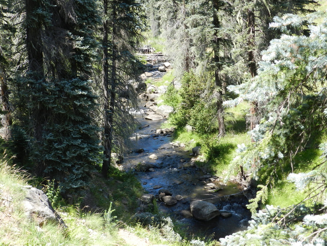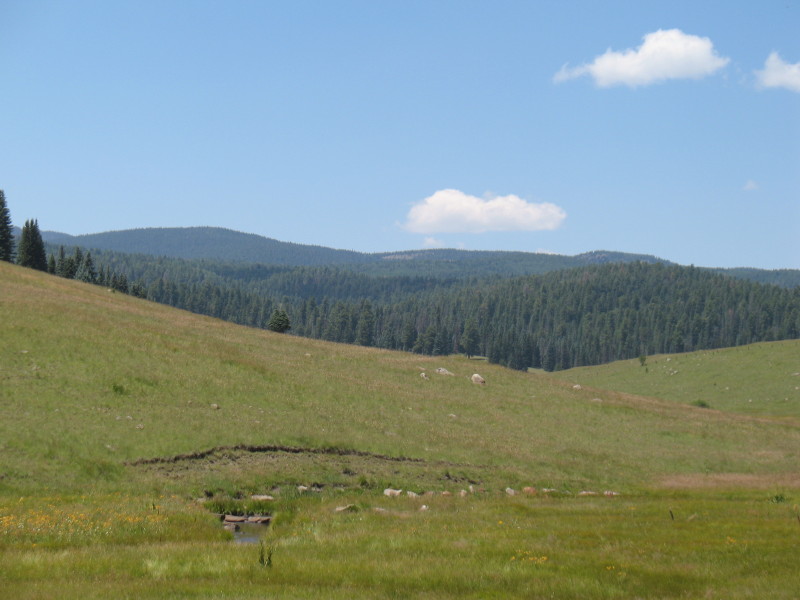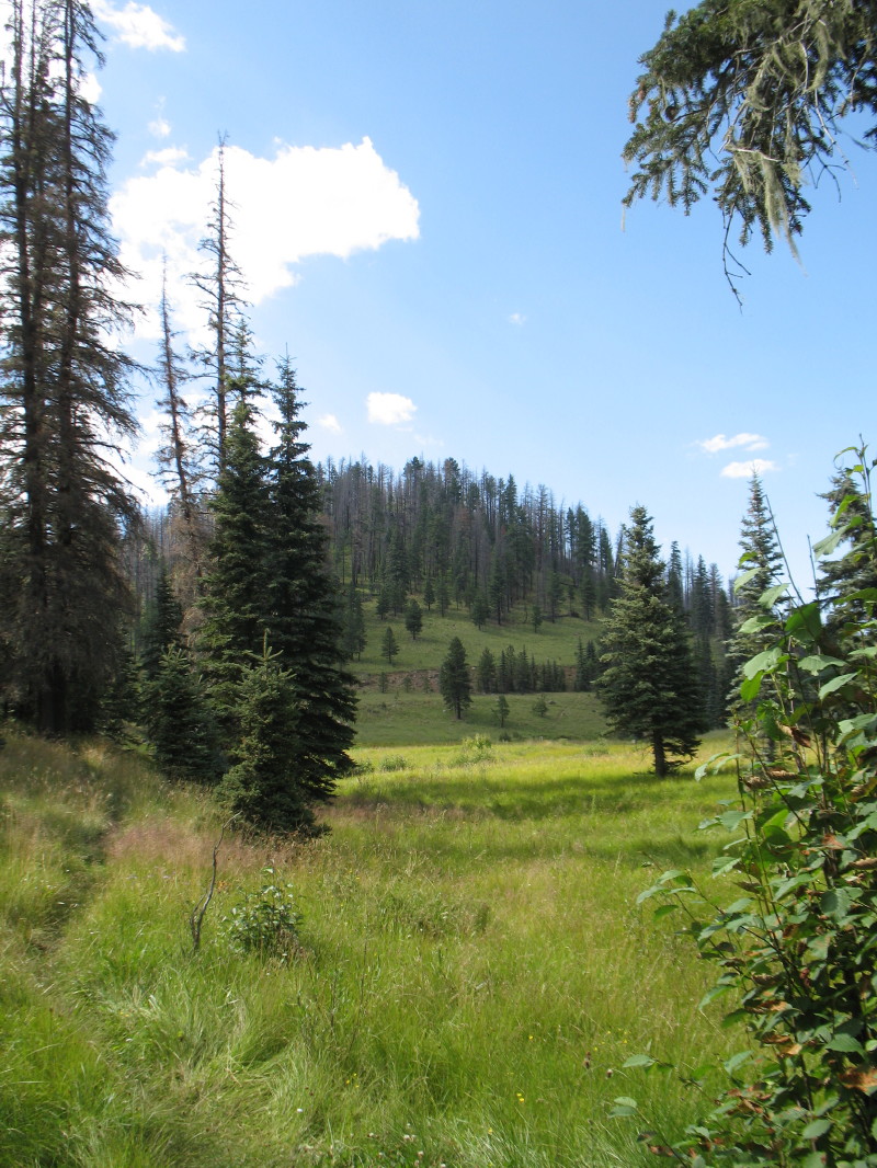 We were surrounded to the northwest by a large meadow with a meandering creek running through it. In the distance this ran up hillsides spruce, pine and aspen groves atop the hills.