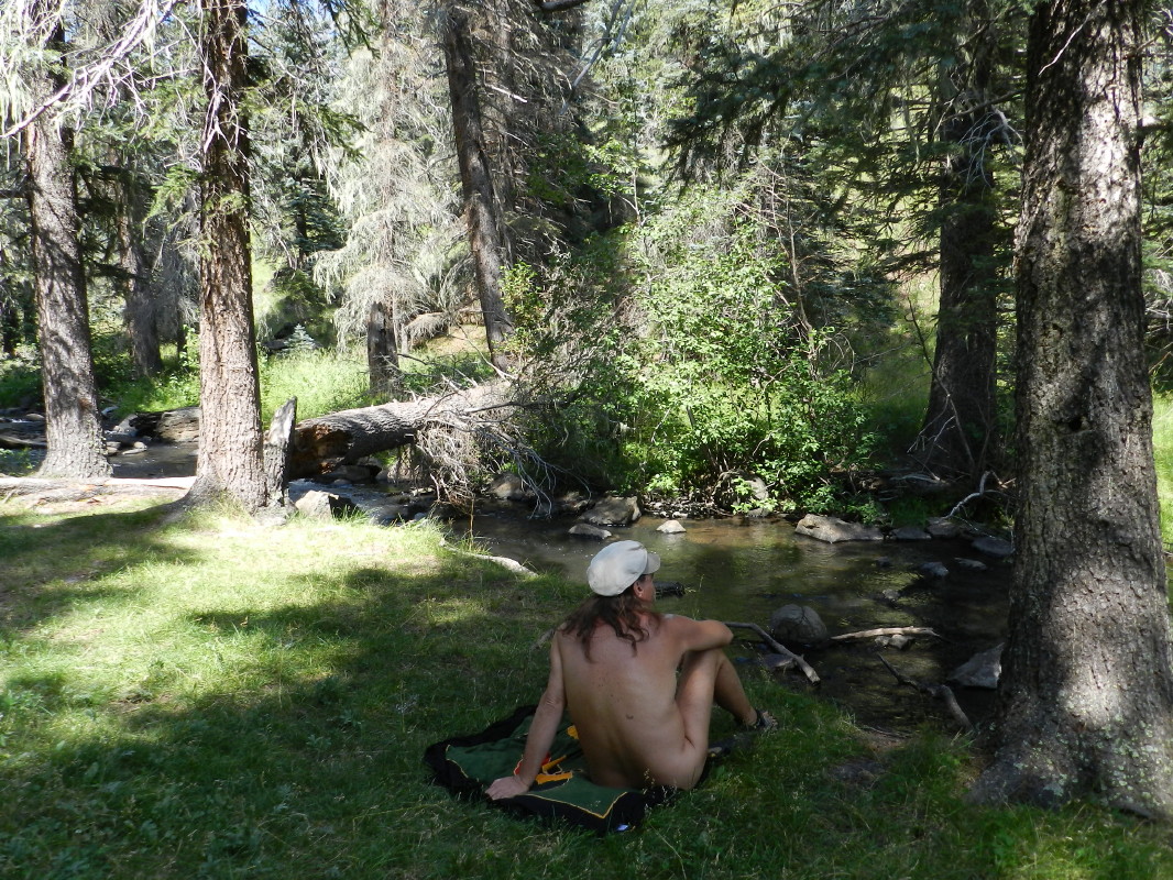 We sat eating a snack lunch. Energy blueberry cubes, almonds, cashews, a pomegranate/chia cliff-bar, raw carrots, and dehydrated garlic hummus and black refried beans with dehydrated apple slivers. We also nibbled on seedless red grapes. I elongated the sarong and stretched out wonderfully nude next to DF, my arm around her as we enjoyed the babbling brook, speculated if the dead spruce amongst the others were from beetles, fire or the moss hanging from the branches.