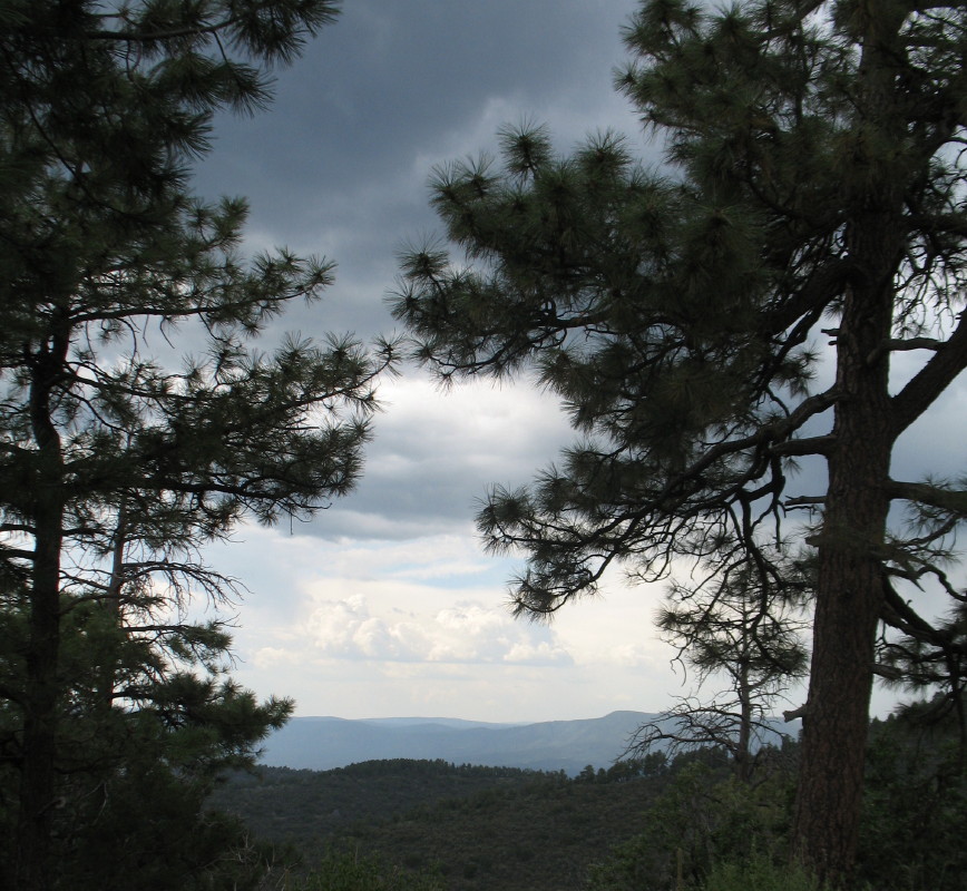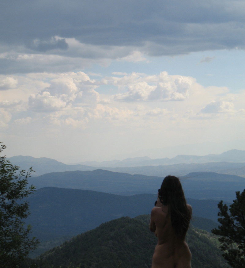 We drove down off of the hill and stopped at the stream where we had hiked the day before. At the trailhead, DF needed to do a water ritual for the project that she had been working on the previous weekend and earlier in the week. She wanted to be in sync with a few hundred other participants back in Tucson at a gathering. I knew that we would be up to twenty minutes with this. The place that she chose was the beach next to the road near the trailhead, where we had replenished our water supply the afternoon before. She slipped on a light sundress and I wrapped my kilt around me because the road was right there above us, if someone drove by. With me reading like an orator, she interacted with her heart and the stream in a sacred manner, holding her hands in the cold water in prayer. Above us a huge ominous deep gray storm cloud was coming up from the east. It looked like something from the mountain of Mordor. I wondered if it was a preview of the afternoon storm system that we might, or might not encounter.