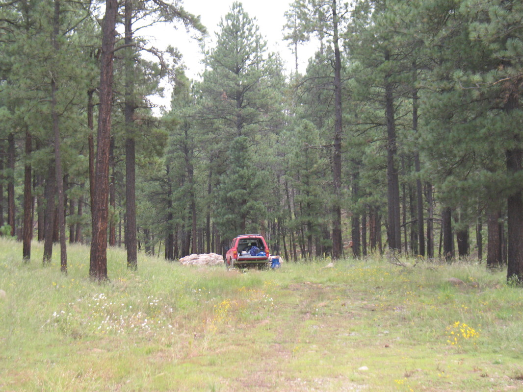 As we traveled up the 666 highway among magnificent vistas and pines that afternoon, there were many camouflage uniforms all along the road. On the drive the day before, we had encountered maybe six or eight vehicles in the entire seventy miles. Today there were battalions of these guys. One red truck had a pair of antlers attached to a deer in the back of his bed. I found out later that bow hunting season started that Friday. That explained the guilty looks on those young men’s faces the day before. They were out jumping the gun. Everywhere, they were unpacking, sitting, driving slowly, and watching. One white P/U had even stopped dead in the middle of the curving highway and waved us to pass!