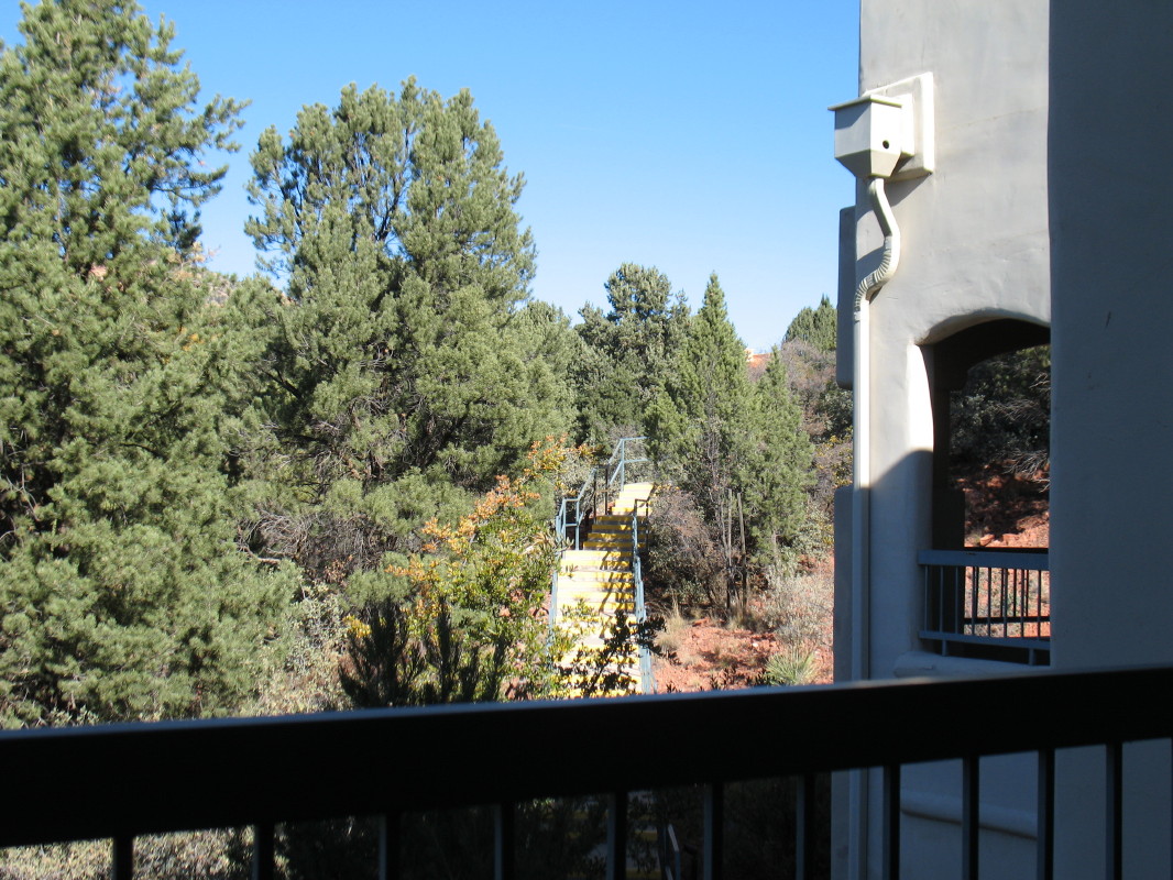 The next leisurely morning, we awoke to look out of the window. We looked through the pinion pine, out onto a fairway and on, to some fine red rock sculptured hills. We chose to have breakfast out on the porch balcony.