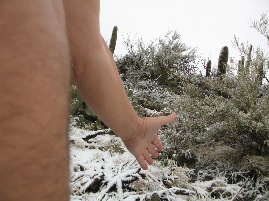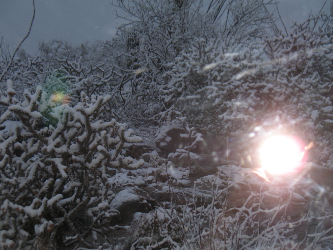 Sunday was a great day at the sweat. It is quite the community, very spiritual. A great deal of energy and ritual today, helping a mother and family. They had just lost an 8 week old child to SIDS. Wonderful love and support from everyone. Just nice naked weather with friends and new acquaintances. Monday, I found myself studying in the sun, I nearly burned, getting quite red. Tuesday, it was once again a good day for the sun bathing. Wednesday, BLIZZARD! Not desert lizard! I said, “Desert Blizzard!” Two or three inches in the afternoon and three more towards evening, AND then some. Maybe not much where you hang out, but here…! This IS after all, the Sonoran DESERT.