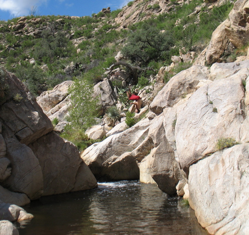 I strip down and slowly wade into the water. I notice that it has that harmless brown tint like all of the Catalina Mountain streams. There is a chill, but it shortly becomes wonderful. I am suddenly overcome by a spontaneous Native American style chanting. What the heck, I begin to go with the rhythm and vibration in the water. These hikes are a spiritual soulful experience at times. The spirit of song has popped up several times today.