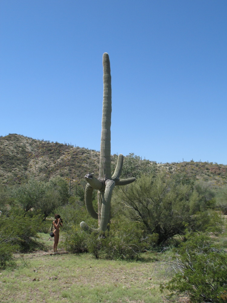 We found a large wash to use as a wide trail. We took a walk further down it, until deciding to return. DF told me that she was getting hungry and the water was half gone. It was time. We had spontaneously wandered naked into the fascination of the desert much further than intended.