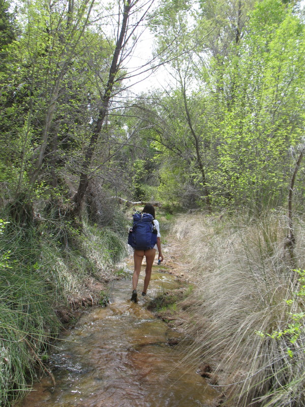 We stop for a break and a snack, and to sit. We note that it is now 3:30. We need to make camp no later than 4:30. We don’t know how far we have come, and what is ahead. The vegetation appears to be transitioning into a lower desert, which harbors scorpions and ants more typically. If the end of the water comes soon, it is a mile and a half to the river, exposed and in a hurry. We decide to backtrack a short distance and tomorrow take our time returning. We had spotted a very nice camping area there…we’re tired.