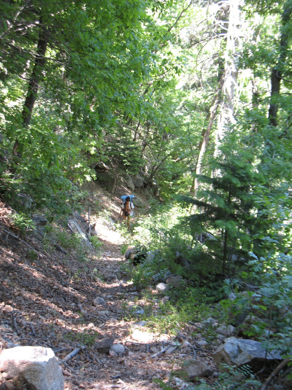 Then, the trail drops, just as it had risen, in a sharp switchback through pines. Pine needles coat the trail here. They are thick. Where the sun peaks through it is hot. We are much lower than we had been and the afternoon highs are giving us just a taste of the excessive heatwave below us.