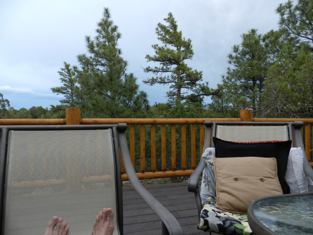 Sun shouts in through open blinds. All I see is forest out the window. Our hostess beckons us out of bed. We have scored! The rest of the house is wonderful. We enter the great room with its tall ceilings and the western and Native American décor. This is spacious and well done. Barefoot all over, we explore. The porch/balcony is huge, overlooking a forested valley. It is quiet. There is a very good view shed, yet the adjacent neighbors on each side have no sight of us. The whole is private. We lean on the railing and soak it in.