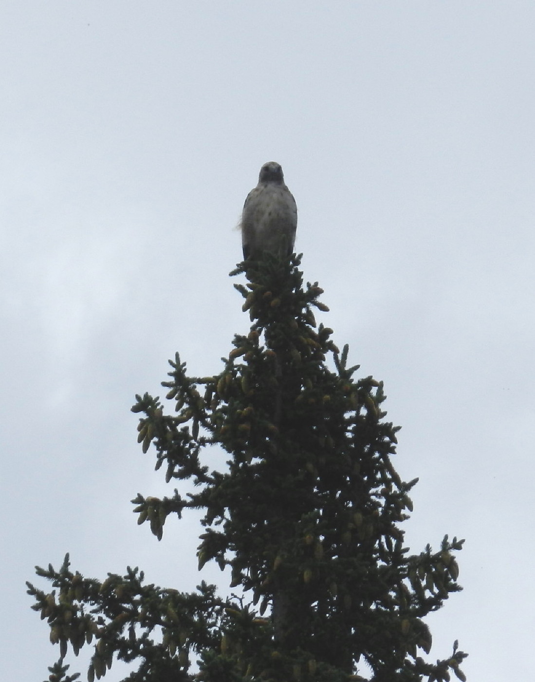 Today, we notice a beautiful large hawk topping a tree like a Christmas ornament.