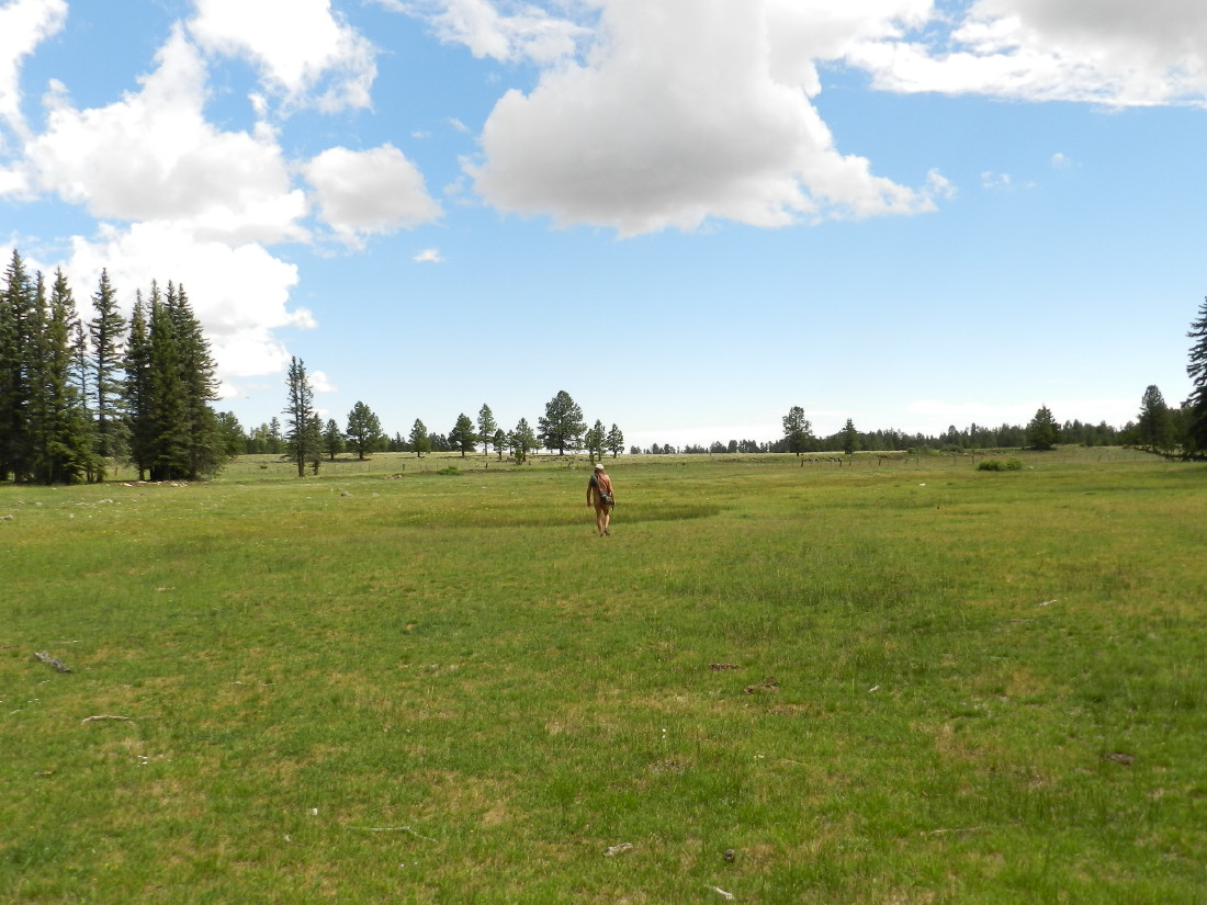 The meadow is bordered with forest made up of Christmas tree-like blue spruce and pine. Occasionally, a towering red ponderosa pine will stand out.