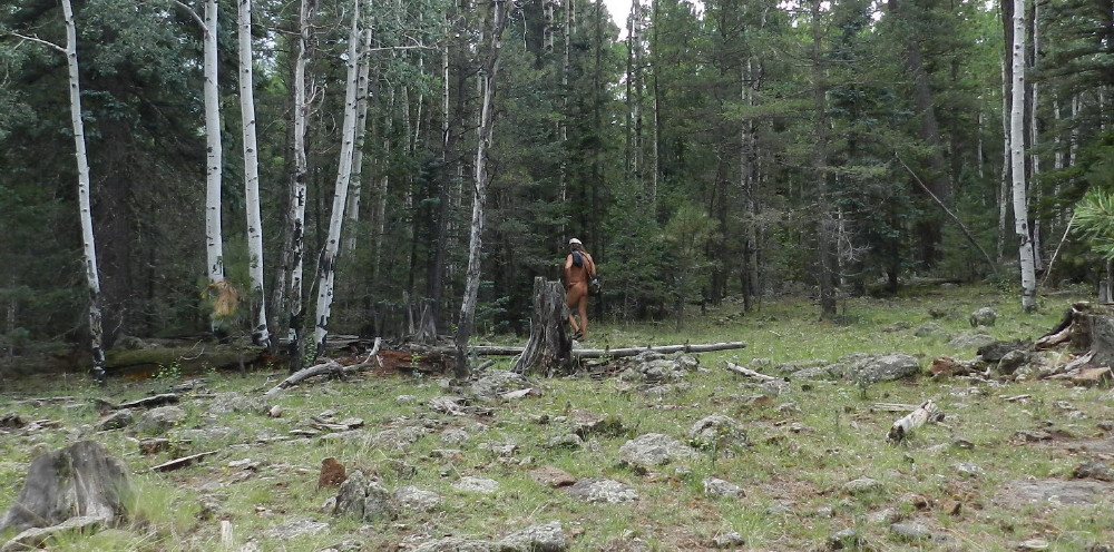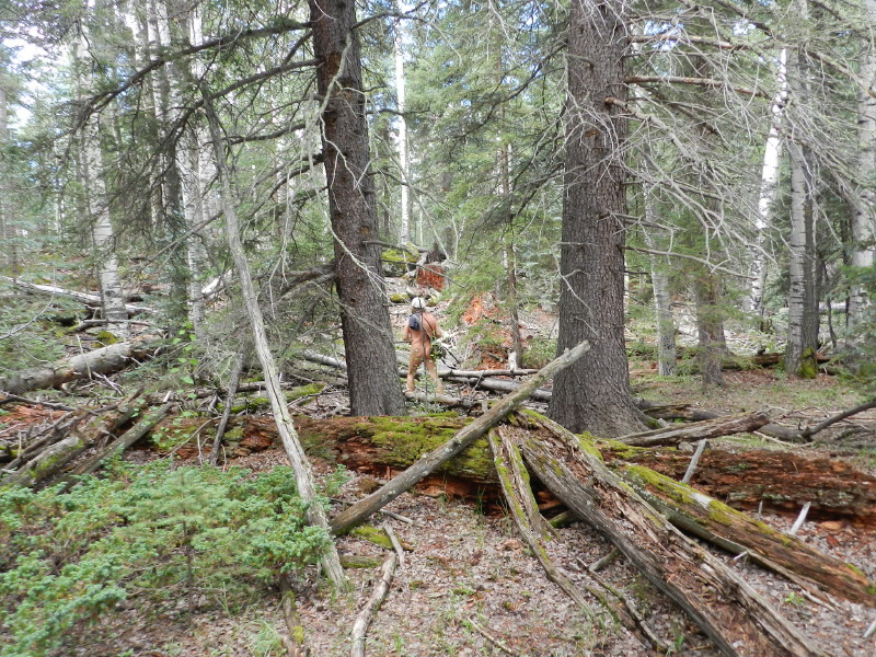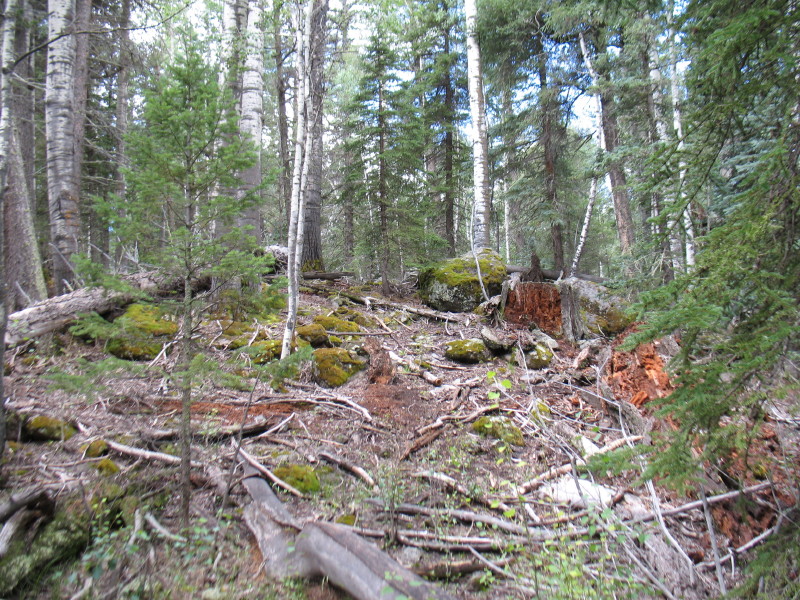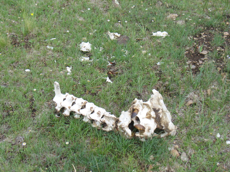 Under a stand of spruce, where shade prohibits the thick vegetation, we find stepping stone rocks. There are large sun-bleached bones spread about in the area. Something has died here, probably a cow. Perhaps it was the victim of the newly released Mexican wolves, which are repopulating the White Mountains.