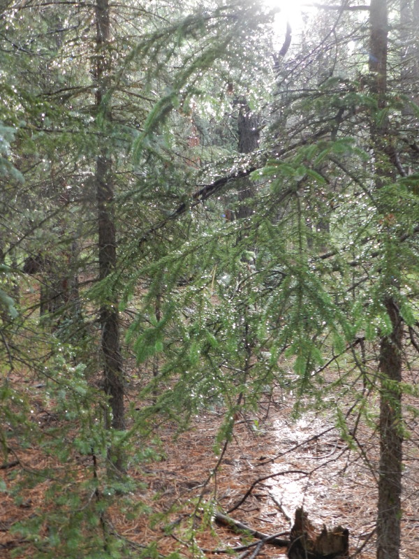 The rains continue for the next six hours. DF gives my shoulders and back a very helpful massage in the tent. It is chilly. She uses beach towels to cover me and keep me warm. We listen to the runoff from the trees onto the large tarp, thinking that it is still raining, but climbing out of the tent, we discover that it has stopped. Everything is soaking wet.