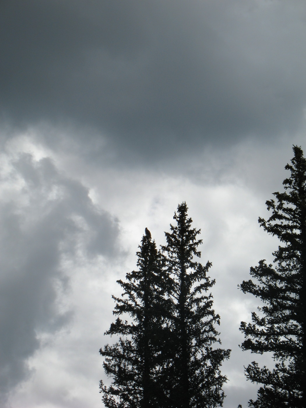 The white Jeep drives by and across the meadow to a fence gate, passing through. I mention the noise from those kids and that we are on “a spiritual retreat,” so another message is given not directly at them. We complement their tarp arrangement and tell them how handy it will be. They mention that they had had to stay at a developed official campground and had been canoeing. A canoe is strapped to the roof.