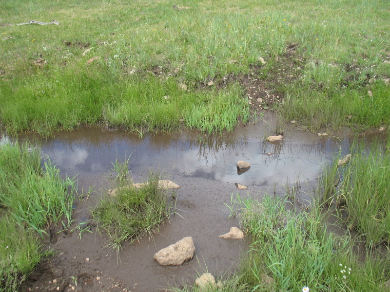 On this day, we have been stepping over hundreds of cow paddies. After the crystal clean water escapes the rocks at the spring, within a few hundred feet, the waters begin to show the typical signs of pollution by cattle. The meadow’s grassy lawn has been mowed by huge beasts. This is one of the few perineal creeks untouched by the devastating fires.