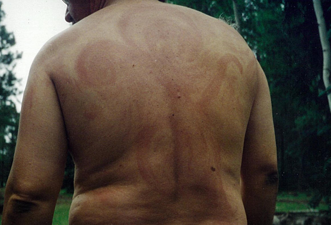 I eventually wiped off the costume with paper towels creating a tie dye pattern on them. I hung these on the main pole saying farewell to the Rainbow man. The paint wasn’t dispersed evenly. I had burned in some areas as streaks. I looked as if I had been whipped and scared. The reaction was quite different.