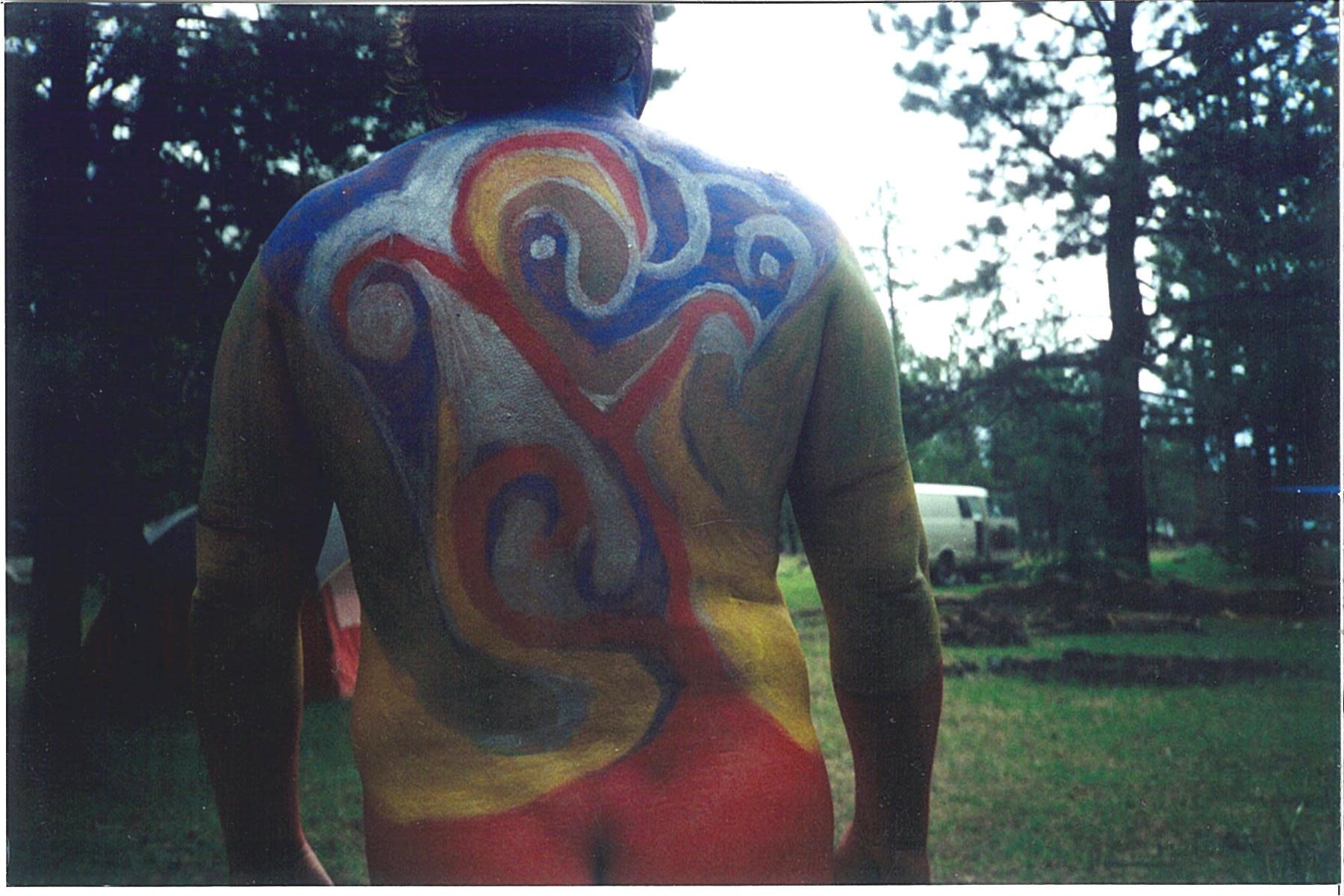 We travel through to the next meadow, then to where I had walked through camps through the forest to the creek. Before, during the Gathering, I had been naked but for body paint. The first day I was a kokopelli black and white. The next, I found an art student from ASU to decorate me. I required bars of bright rainbow colored paint placed to the corresponding chakras. I left the rest to her creativity. She took each bar and created psychedelic swirling. I wandered through the masses, most were delighted, many hugging me. They called me the Rainbow Man. It felt like an honor.