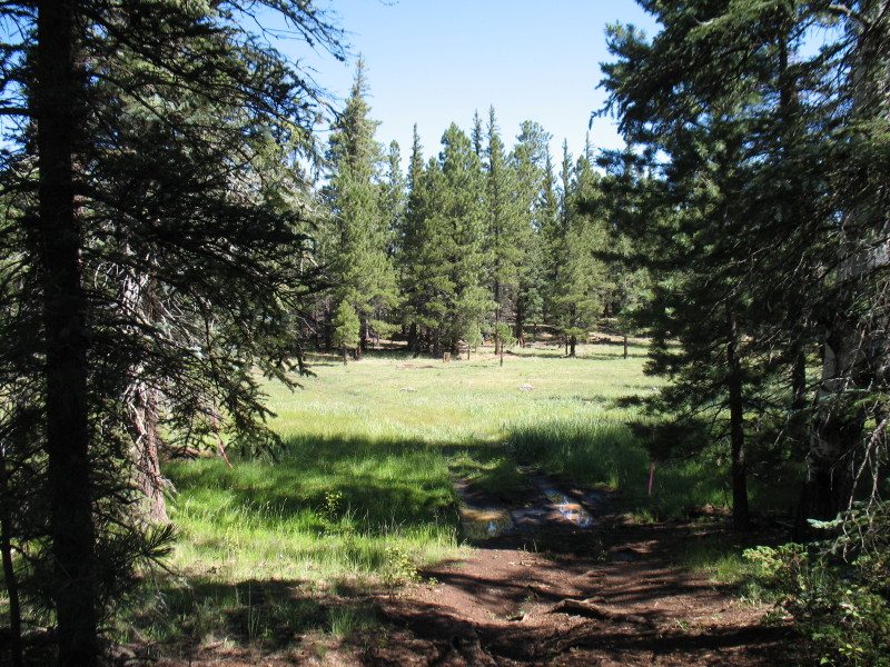 At a Y in the road, we go through another rustic gate. This leads us to a wet meadow, which appears to run into a gorge.