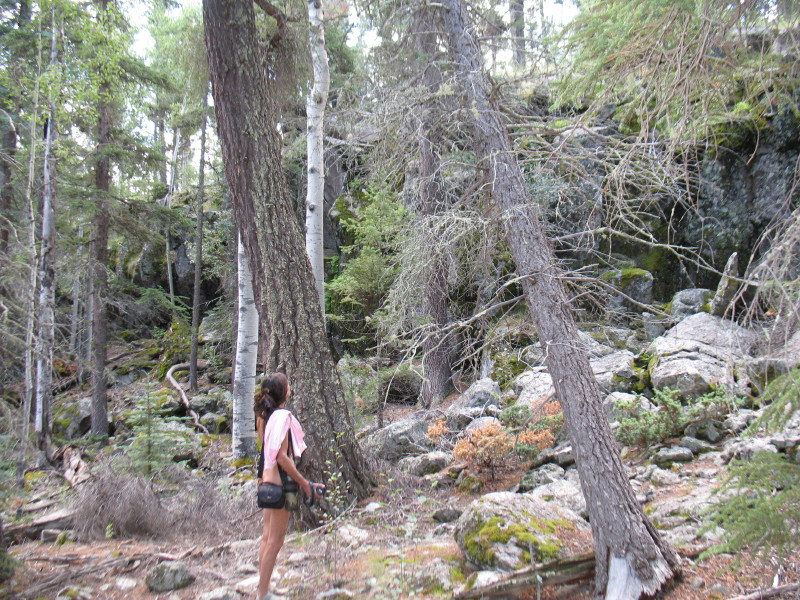 We come to a larger rain pond in the middle of the road. I remember just the other day, that I had driven along the side, not knowing what might be under the water. There are slippery exposed roots there. As we passed the rear tires hit these roots and the rear end slipped deep into the puddle. I was glad to have 4×4 rear auto-locker’s traction in that slimy underwater surface. Today, deeper still, the roots are buried. We walk along the other edge and climb through the low dead branches of a spruce, pushing them out of the way and continue on this pleasant road.