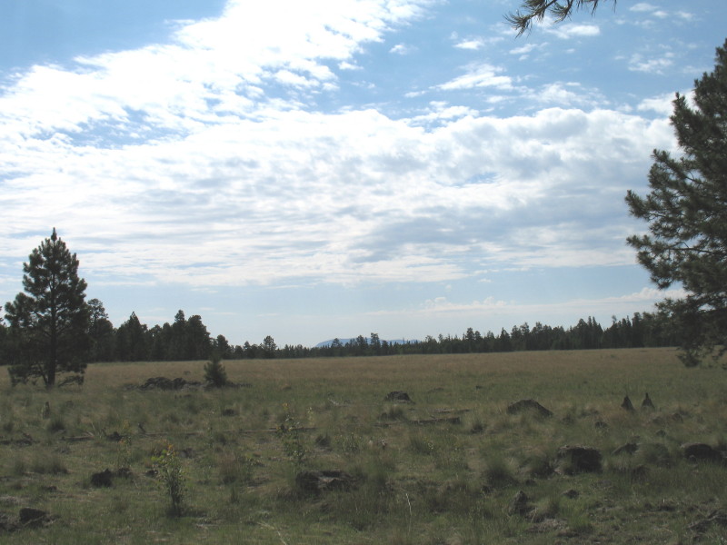 We see a huge meadow to our right, through the trees. This is a remote place, like where we might dream of seeing a mighty horned elk with a herd of cows. There is what looks like a jeep trail leading off toward it. We give the disturbance in the grasses a try. We wander out into this isolated vastness, which is walled by a rich deep green forest. The grasses are taller, there is no over-browsing by cattle. There are no cow pies, but many rocks to step over. The whole of it seems very private. Perhaps sometime, a place for a tent might be cleared of the frequent exposed volcanic rock. I imagine that this might have been a place with a hunting blind. It could be a great place to wait for wildlife observation. There are no herds of elk, nor deer, no browsing bears, not even a bunny, but we are not disappointed. There is something very special here.