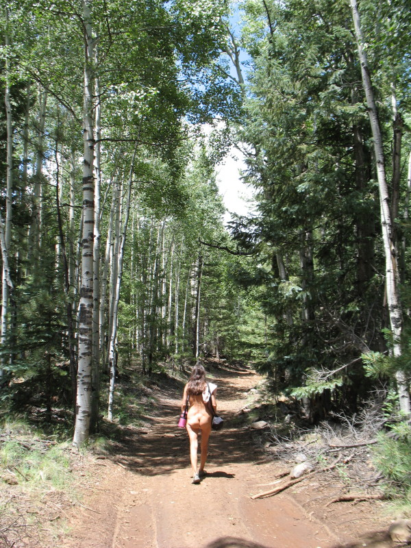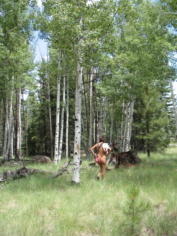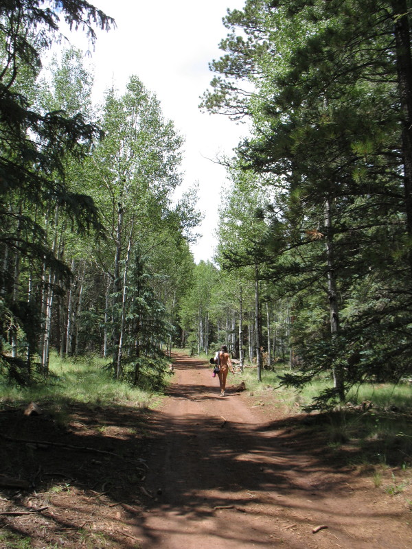 With our curiosity leading the way, not much more, we have decided to try another fork in the same road that we have been down twice now. This one might lead us to the gorge made over eons by the creek. This one might bring us to a creek-side camping spot for the future. It might lead us there and through to the miles in the distance. Perhaps it may lead out of the forest and onto the grassy high plains and vistas looking down into the desert valley to the north. Whatever happens, it will lead to the sense of freedom, connectedness, sensuality and abandon by doing it naked.