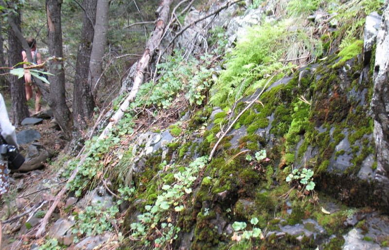 At last, we find remains of an old road coming down the hillside, probably a part of that private property sign. There is a large hole which isn’t natural being taken over by nature. Our time is running low.