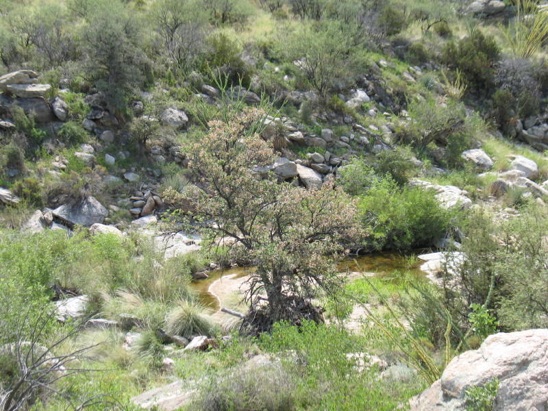 We strip off our shoes, snack and soaked it in. What a wonderful swimmin’ hole. The view is for miles, looking out at the Catalina’s across the pass and downstream. Upstream, the very close green Rincon Mountains are topped with granite domes.