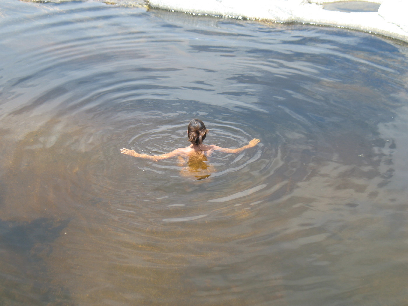It is deeper than I am tall, a bit cooler and swimmable. I creep up to a sandy height and just stand there, noticing the different spots of varying temperatures. I find a huge pleased grin on my face.