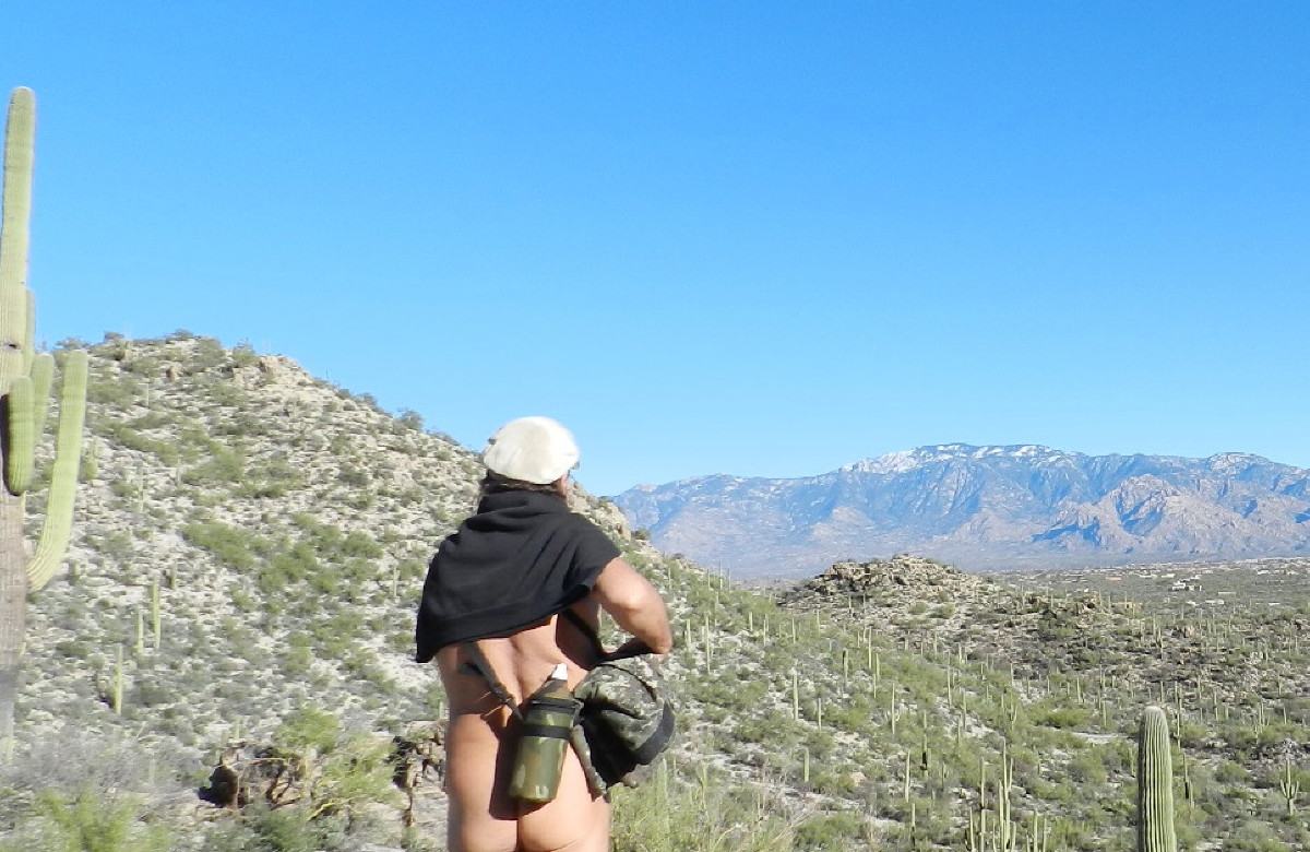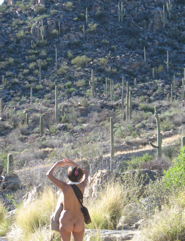 He looks my way. When he arrives in passing, he stops. He is breathing strongly and looking at me weird. I wonder what his reaction to seeing my distant nudity could be. Could he be one of those one or two percent, that reacts negatively to nudes? He just wants to talk. There is no mention of me getting my picture taken naked in nature. He tells us that he lives about a mile from me and has been coming up here for 25 years. We discuss right of way, legal correctness, and the current events to our easements in these hills.