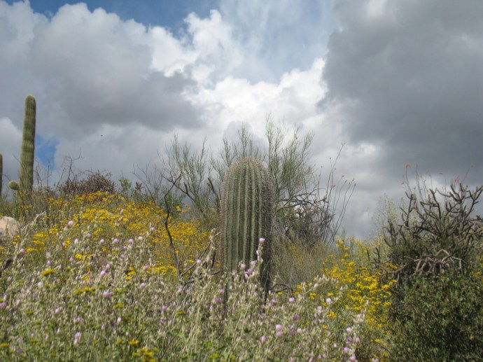 The rain’s warmer temperatures have created an early spring. Many plant species are reacting in an unusual manner. What has happened this last week around here is the explosion of the brittle bush. It has increased since a freeze had trimmed it back a few years ago. It now covers much of the mountain range’s hills. It is coupled with other large plants with hundreds of flowers making a vast rock garden of color. The early leaves of the mesquite are florescent and the ocotillos have green leaves up their stalks a crescendo with their red/orange crown of flowers. Many large stag horn cholla are a burgundy/purple and in good health. Among these dominant species, the more subtle spring blossoms in many colors can be found in patches. Add a turquoise sky and the effect is glorious.