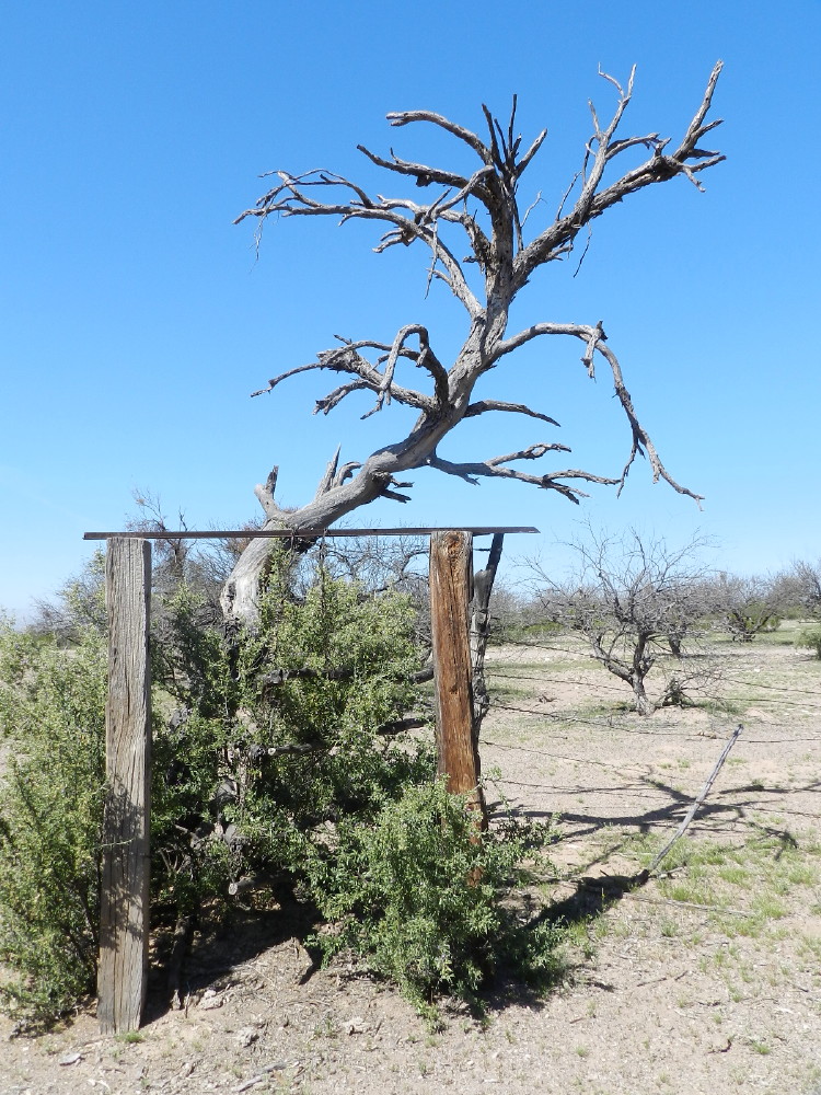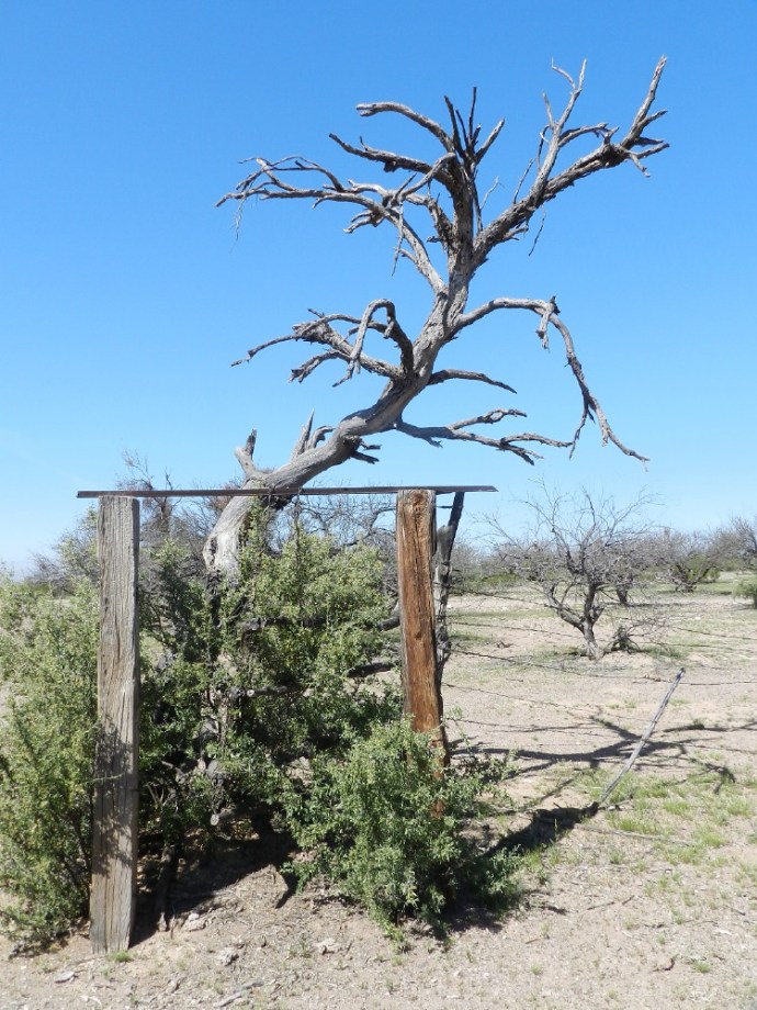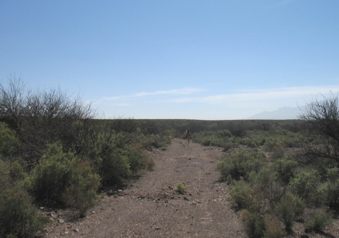 I scratch my lower back on a barb that is hiding in the shade, but it just a light skin wound, no clothing entanglements. Along this fence, according to the satellite photos on google map, there is a road. We soon discover that it is a very little used jeep trail. The exposed rock from the last hard rain hasn’t been disturbed. Only the single file traffic of cattle is found. We have no need for cover-ups, as there is a near certainty that we will have no surprise encounters on our journey’s first leg.