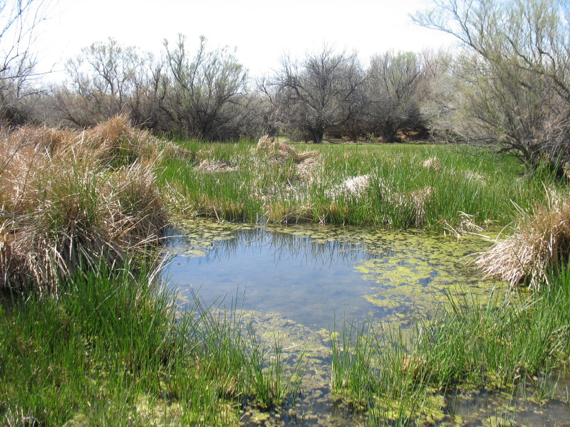 Inspecting the perimeter as best we can, before the thick growth of mesquite and tamarisk blocks us, we see how the stream continues on through the thicket, gently draining the old vessel of life as it fills.
