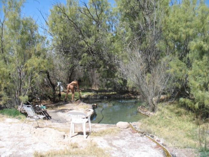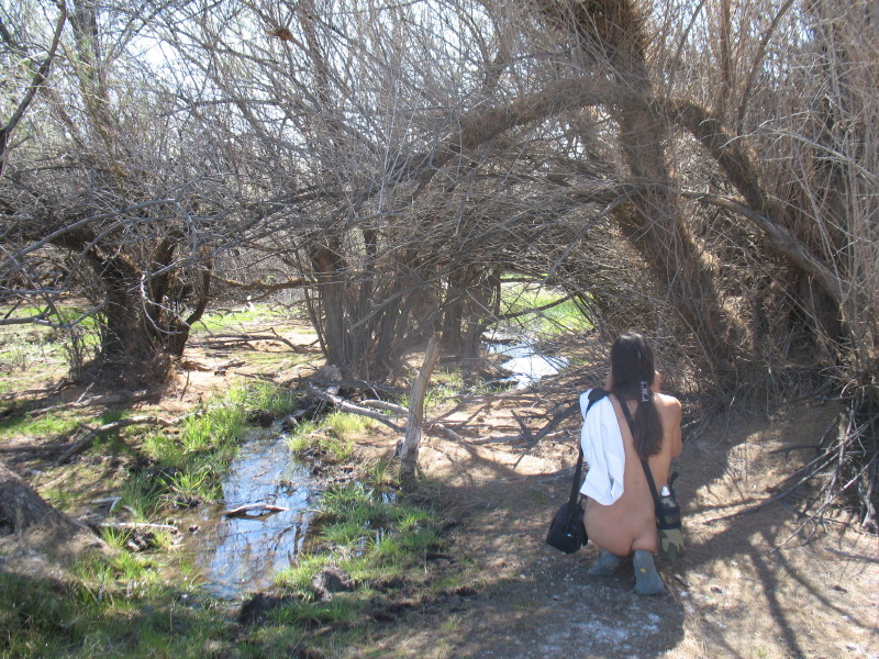 Our arrival takes us to new spots that had been carved out of the tamarisk/mesquite woods. They are near the big pool. Although winter still has its potential, leaving most branches bare, there is quite a bit of shade to be had. We set out our tarp using low branches and below it pitch the net tent. We will be spending all of our time outside and experiencing the sensuality of the weather naked. I have a terry robe and warm mineral waters when the evening turns cooler. A camping quilt will get me through the night which will drop down closer to 50F. My down hood traps in the heat.