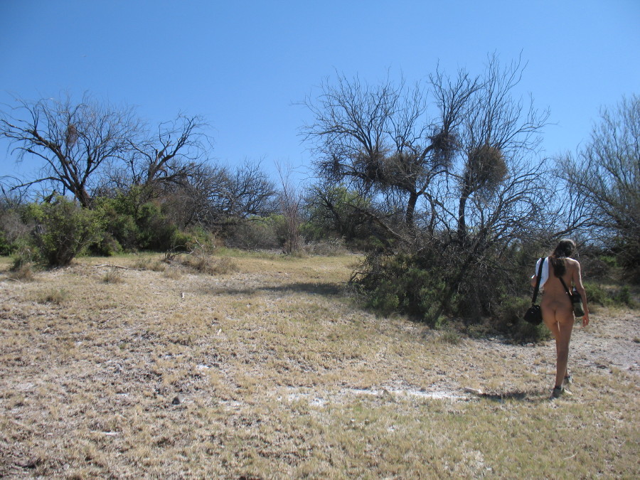 Walking down the trail, we find two people at the guitar pond inside the fence. They ask us how we got through. I tell them. They then just pass through an opening of a wide couple of barbed wire strands. They are on their way to their own walk about, but soon head straight out into the creosote desert. We all then encounter yet another nude man, who is carrying a camera on a tripod. It seems a very busy coincidence.