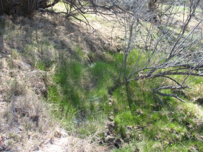 There has been a wonderful refreshing breeze across our bodies. When it stops occasionally, I already can feel the heat of the sun on my back at 10:00am. We continue, discovering unusual cactus and sage along the way in the chest high dominate creosote forest. The trail runs up and down hills. The ridges give us views for miles. At each crest, I look for signs of the cold springs. I have no clear idea what they may be like. I just know approximately where in relation to the riparian area and a road to the west. I am translating a satellite image on my computer and memory to this different perspective. I have no idea what the actual distance is.