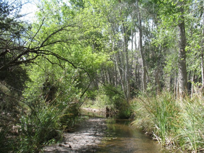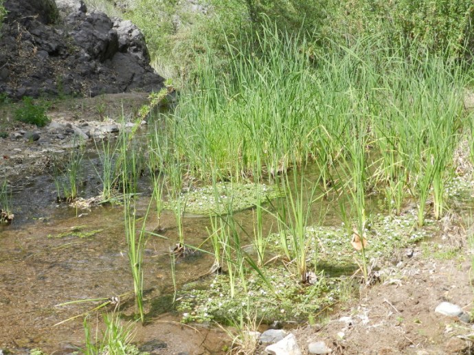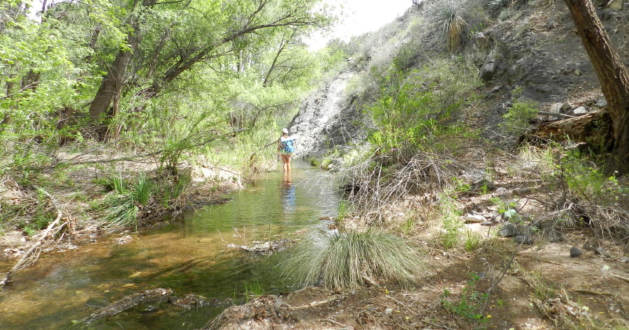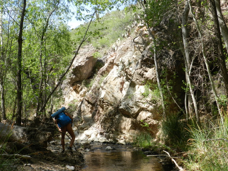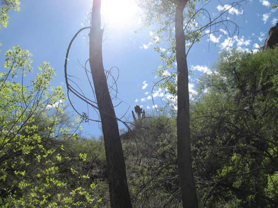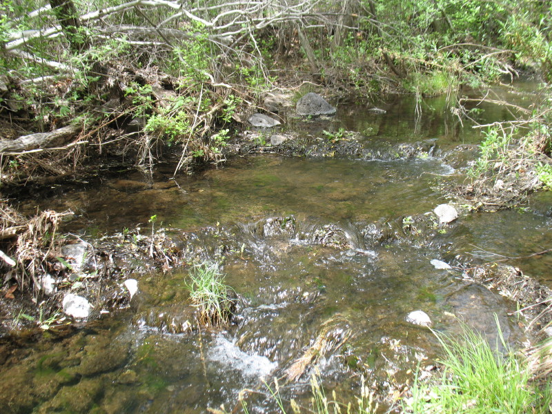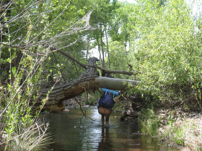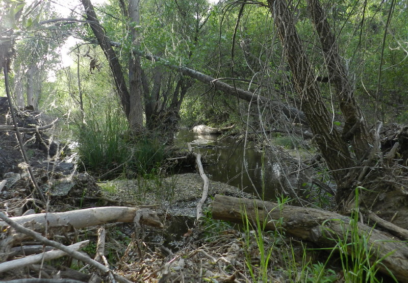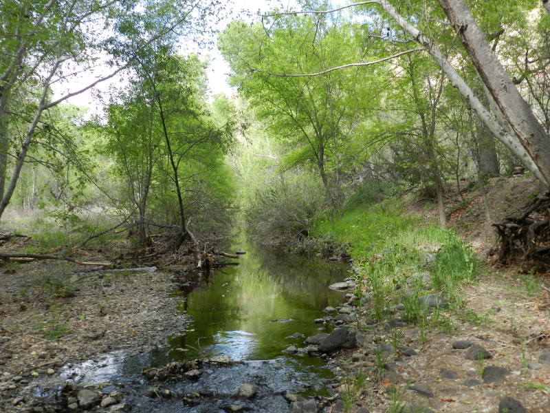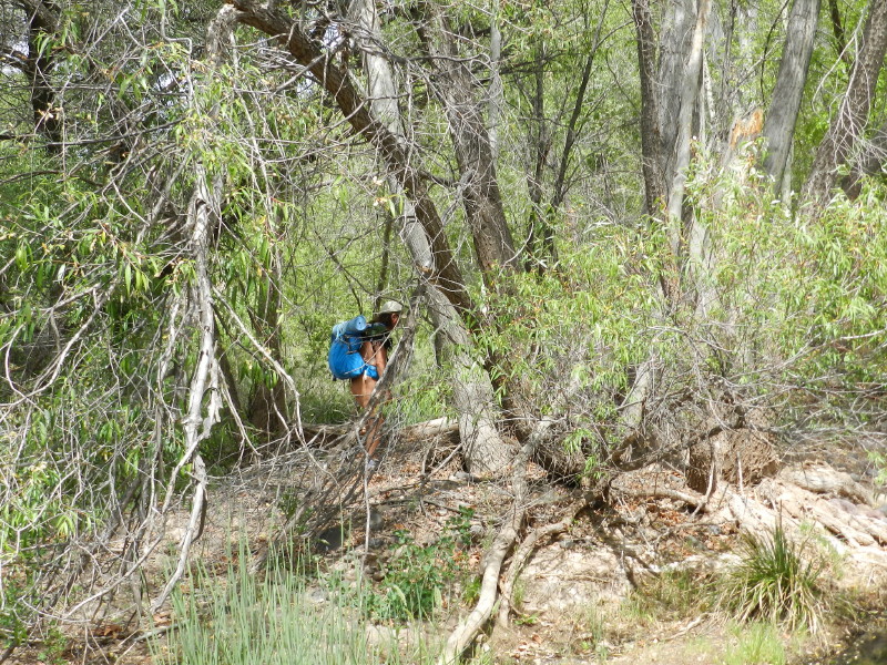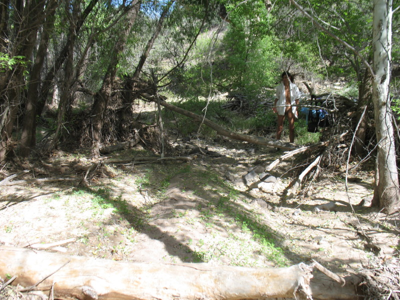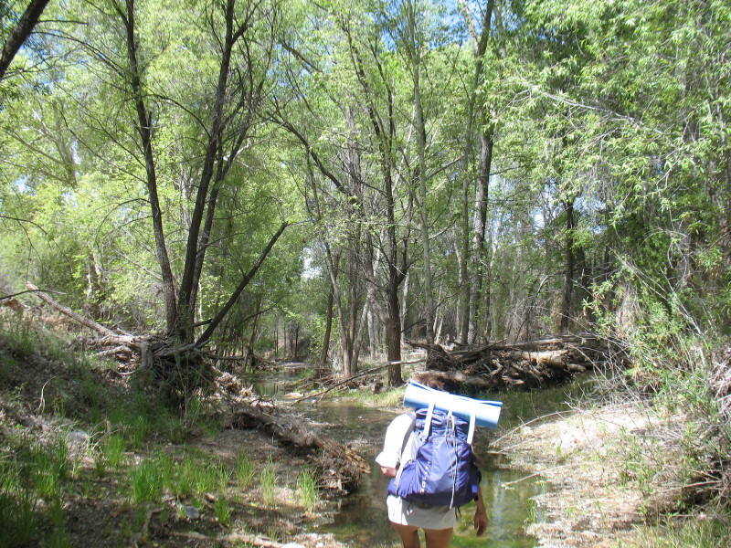 The seep willow reed-like plants align the stream near where the water just freely comes out of the gravely wash. The vegetation quickly becomes too thick to walk into the stream and the stream too deep. It is filled with green muck and too thin to follow. We have to find a way around the wash area through the trees.