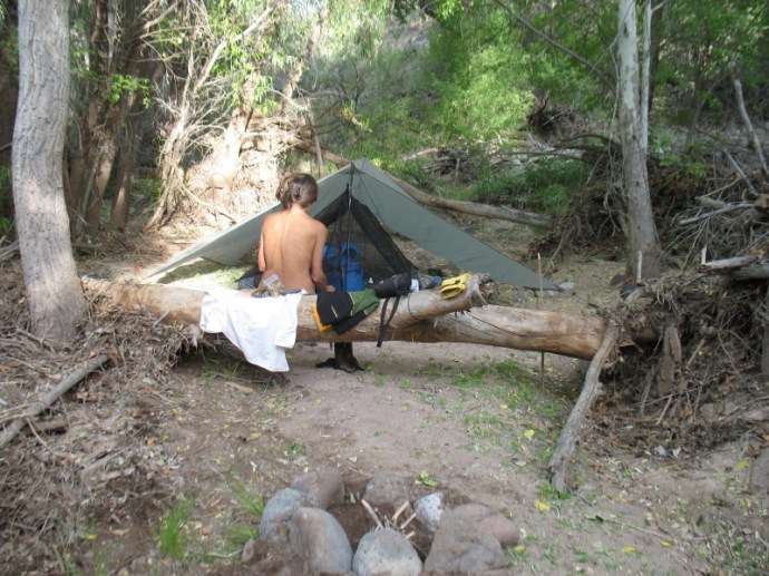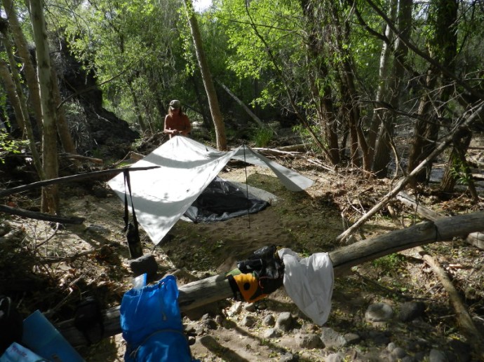 There are trees and a fallen log on each side to sit on and sit things on. I get out the tomahawk and begin to dig and scrape. Soon, digging like this, I am feeling my worn condition even more. DF then produces a long stick and we each take an end to level out our foundation. This works well, just like leveling cement. The tarp has to be set first. The sand is handy, holding up the post as we tie it secure with lines and I pound the stakes in. I am grateful that I have those sand worthy stakes. But still some of them meet river rock and can’t be driven deep enough. We begin to look for appropriate rocks to tie to. Each rock we lift, we discover that somebody, or group have a habitat under it. Critters squirm and quickly run away. Some are nasty looking. Here is more evidence of the abundance of life and another food source in the ecological food chains.