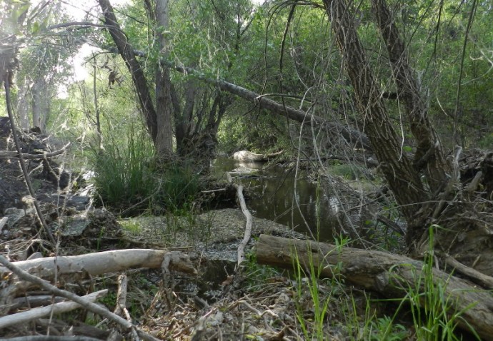 There is evidence of a major flood, which has been mostly recovered from. The exposed roots, the redirected flows, the fallen trees, all contribute to debris which forms islands and collects silt, which create soil that is already teeming with fresh growth in green. Fields of florescent reeds, new seep willow, moss and a variety of small plants are seen creating new abundant life in the bed of fresh soil.