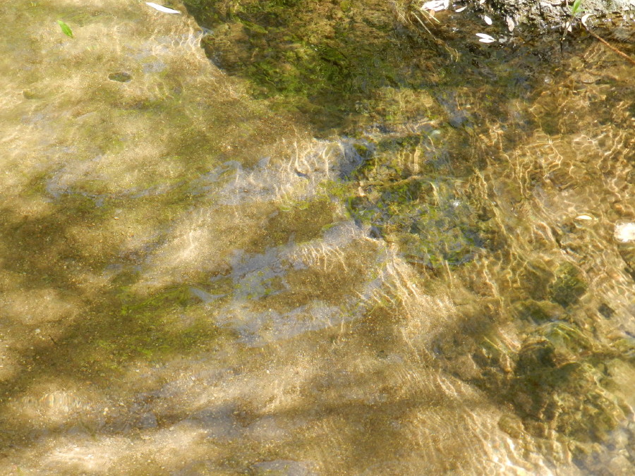 There is more algae, supporting more small fish. They are constantly darting away at a surprisingly rapid rate. Some are tiny like tadpoles. Some are six or eight inches in length. The rocks are extremely slippery and the water crystal clear, allowing the infinite number of colors of rock to glow below the surface.