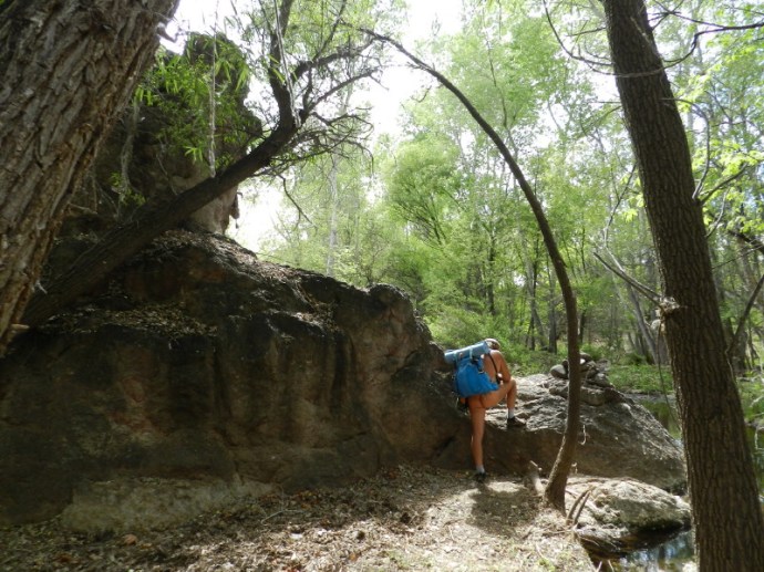 These are the first bolder like rock forms around the gentle stream bed and the perfect place to sit and have a break. We sit on a sloping rock naked, eating a re-hydrated lunch, enchanted by our surroundings.