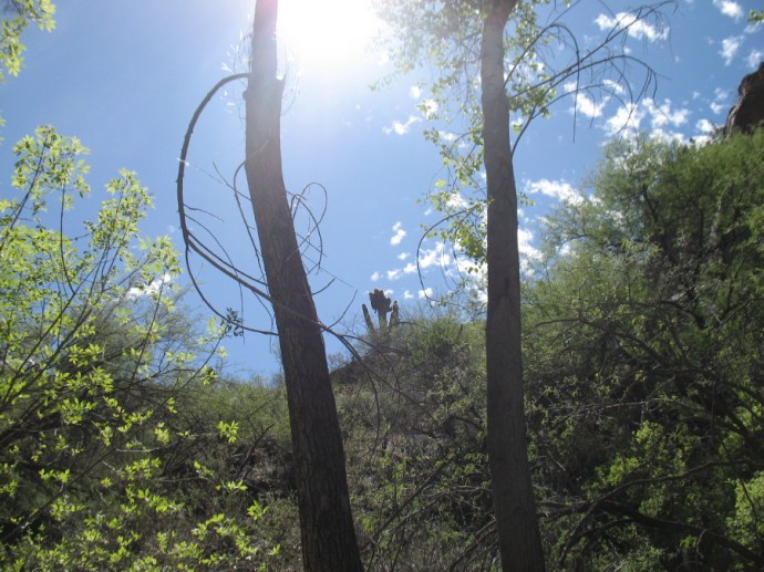 In the tent, we are not sleeping through the night. Everything outside is brightly lit by the full moon. Then, it seems to darken and later light returns. We think that it is tree cover from the huge cottonwood nearby. Later, after returning to Tucson, we discover that there had been an eclipse.