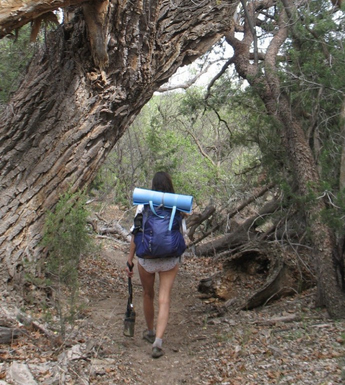 We have every indication that we won’t encounter anyone, but being a holiday weekend, keeping a quick cover strategy at hand seems expedient. After about half a mile, I see a cat track. A few feet later, there are wet marks in the dirt. Could it be marking territory? I wonder. I notify DF and we very silently, very alert, creep forward, stalking some poor imagined beast. Then, in the distance, we hear sounds! Naw, it is just voices, but not just voices, but loud sounds and lots of them. It sounds like a party. We quickly cover up. I tie my sarong miniskirt in wrap around style and DF straitens her shirt and makes sure that it is tucked carefully into her backpack belt, also creating a miniskirt, which is just about butt cheek length. Her open front is now a cleavage laden v neck. We are legally covered, but underdressed for a barbeque.