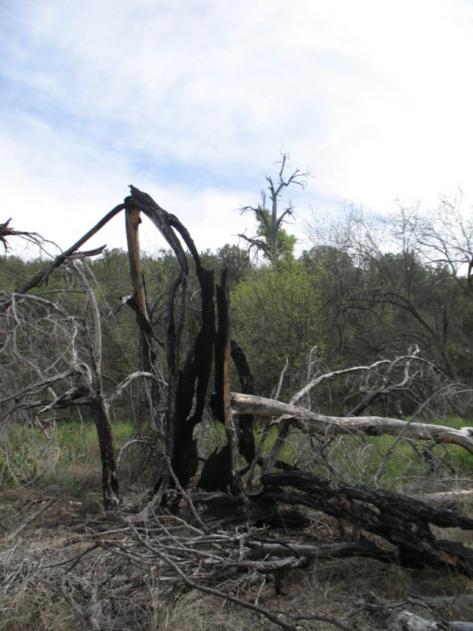 We see no one. We rest where there is evidence of a past fire. Huge tree trunks, deadwood, lay haphazardly.
