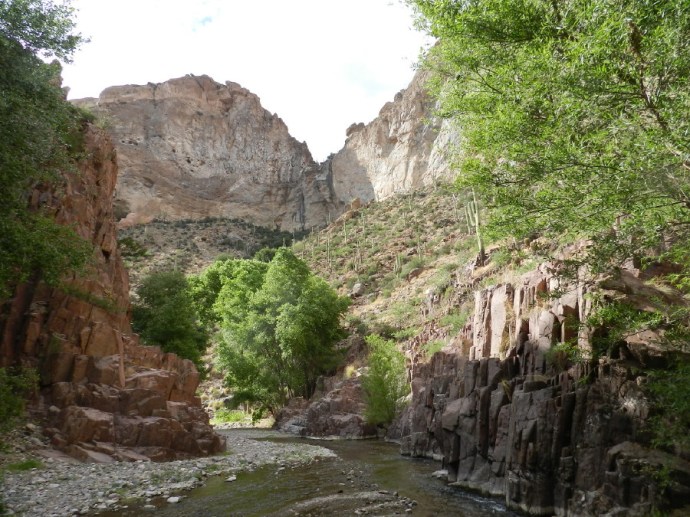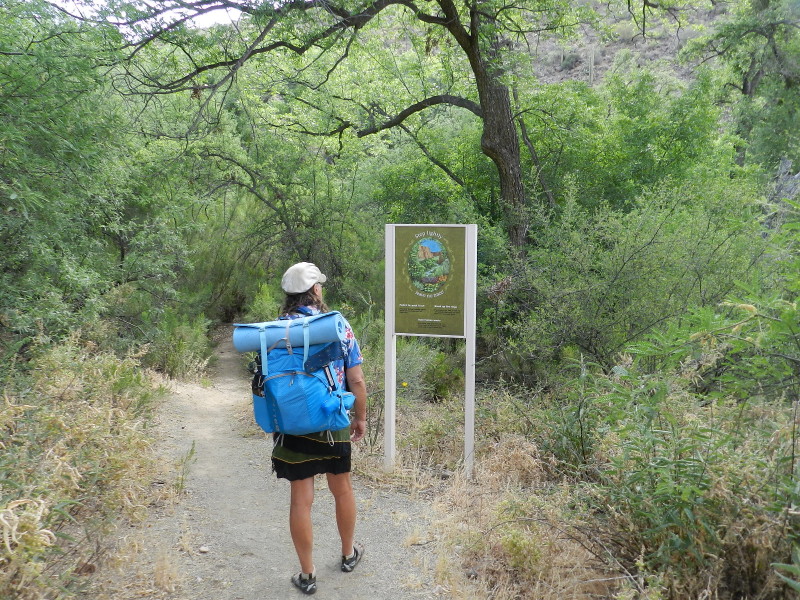 We stroll down the trail through the Sonoran Desert fauna, getting used to the packs. Eventually, we arrive at the base of the canyon with its tall trees and flow of water.