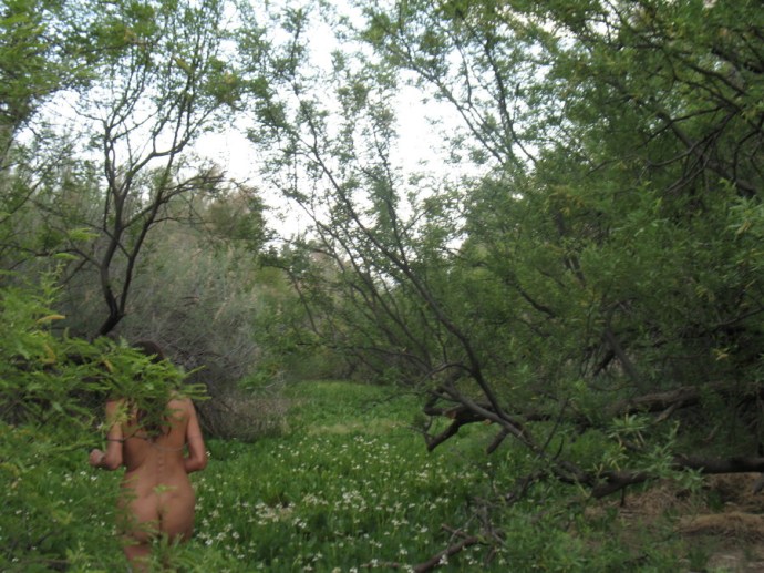 We step through the brush along a trail with its bridge of upended severed logs, arriving in the swimming pool area. The wind is up today, but the thick trees break its effects. With temperatures in the 90F’s, the breeze is refreshing when nude.