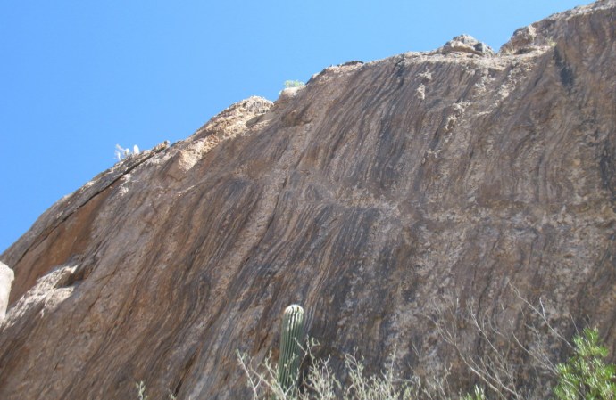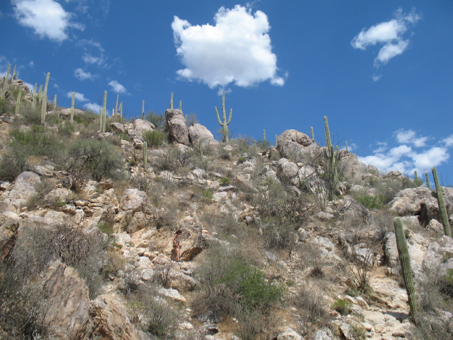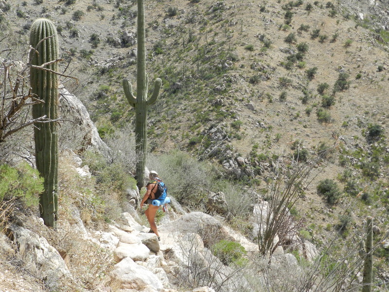 Across the path, I watch the town of Oro valley miles away from a birds eye view through the closer rock formations, as the ridges rise. My attention then drifts to the vegetation in the immediate proximity. A lizard is sitting there on a rock, taking in sun, as I shelter just a few feet away. He is doing pushups, as lizards do. But this one reveals something hidden as he rises. It is that time of year, the hottest and driest, when the reptiles change color and willing young men put on display for the girls. We have seen several varieties of sporty lizard suitors along the way. They have been just off of the trail, as we pass. This one has shown no distinction, but now, an indescribable distinct belly appears. It is such a deep rich blue that it exceeds the dominance of the celebrated skies. I don’t recall ever seeing such a rich color, yet there, hidden on the bottom of such a small animal, is an azure patch. I grab for the camera as he poses, hoping for another series of pushups to capture this. I have to wonder if there is a possibility that the camera can do this justice.