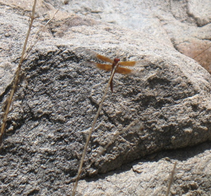 A large blue dragonfly is being chased by a large red one. The red one eventually takes a position next to us on a stick, which is overhanging the pond. It poses, wings spread, the stick bobs in the breeze.