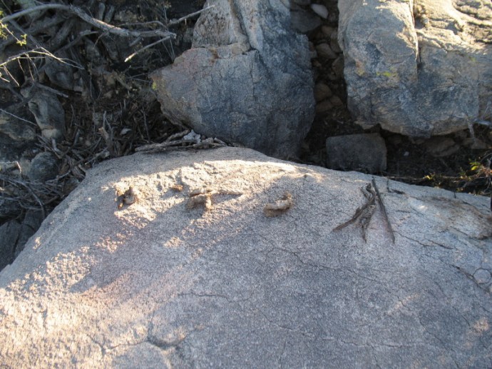I find my way to Havarock. I climb atop, after stepping across the pile of boulders. A packrat has scattered staghorn cholla branches here and there, as if to make a barrier of landmines. My already impeded footing is more challenged. There are several pieces of debris on my boulder.